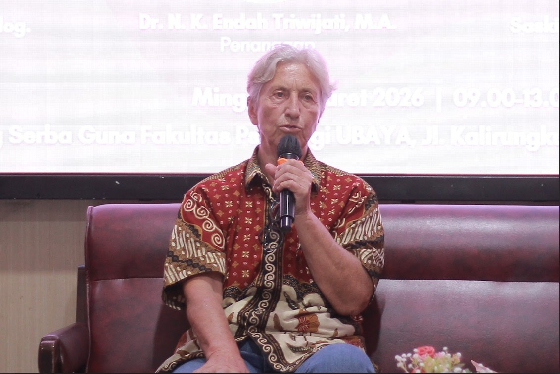 Saskia E.Wieringa profesor studi perempuan dan gender peringati perayaan International Women's Day 2026 dengan bedah buku LBT di Fakultas Psikologi Ubaya, Minggu, 8 Maret 2026.-Rosyidah Ariyanti-Harian Disway