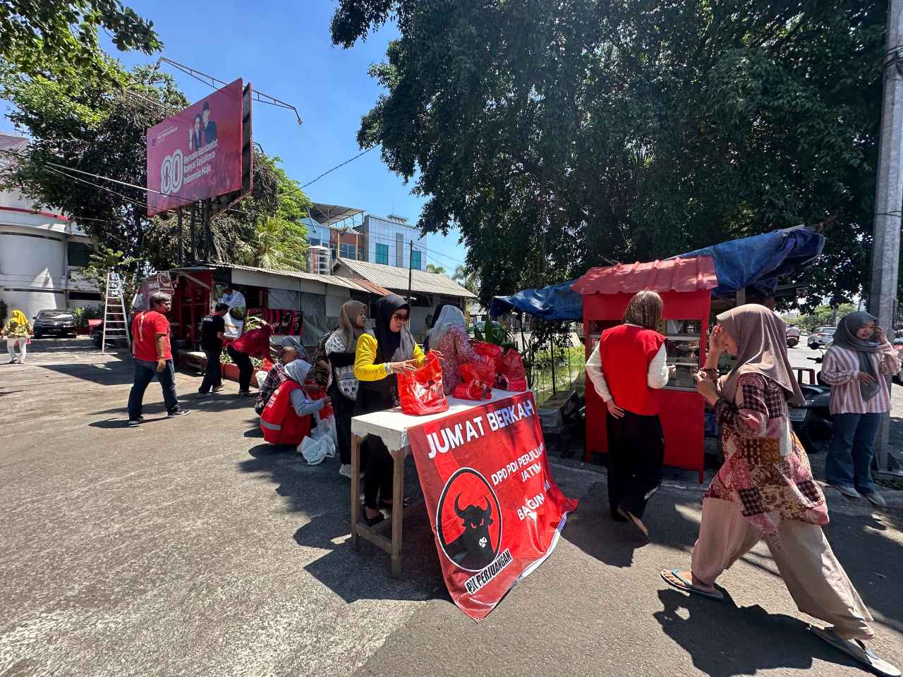 Agenda Jumat Berkah itu berlangsung di halaman kantor DPD PDIP Jatim, Jalan Kendangsari Industri, Surabaya. Sejumlah anggota badan-badan partai hadir dalam kegiatan yang dihadiri warga sekitar tersebut.