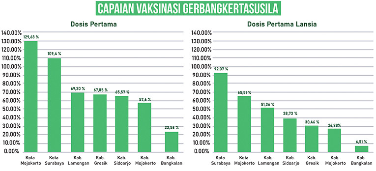 Semua kabupaten/kota di Gerbangkertasusila sudah mencapai target vaksinasi dosis pertamanya. Kecuali Bangkalan. Capaian vaksin mereka baru 23,56 persen. Angkanya sangat timpang jika dibandingkan Kota Mojokerto yang sudah mencapai 129,63 persen. Atau Surabaya yang mencapai 109 persen.