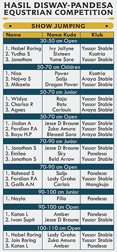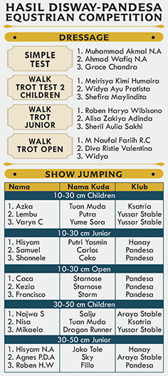 Direktur Pandesa Riding School Bibit Sucipto menambahkan, timnya menurunkan banyak atlet berkuda di event kali ini. Ada 11 atlet yang membawa pulang medali. “Saya melihat para atlet yang turun dari kami sangat kompetitif. Apalagi dalam kelas bergengsi tadi,” katanya.