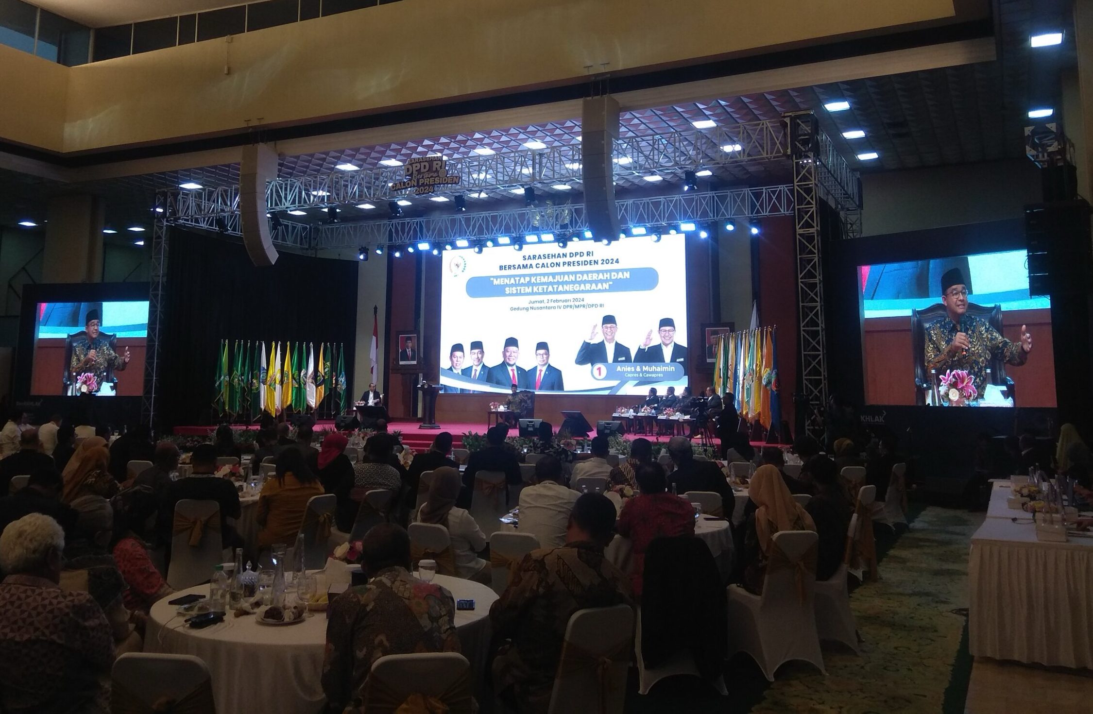 Calon presiden nomor urut satu dari Koalisi Perubahan Anies Baswedan menghadiri Sarasehan DPD RI Bersama Calon Presiden 2024 di Jakarta, Jumat 2 Februari 2024. -AMIN-