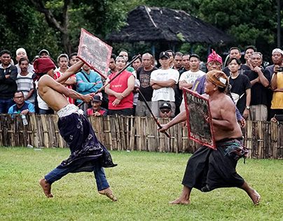 Tradisi Peresean dari Lombok dilaksanakan dengan pertarungan dua orang laki-laki dengan senjata dari rotan dan perisai dari kulit sapi atau kerbau.--pinterest
