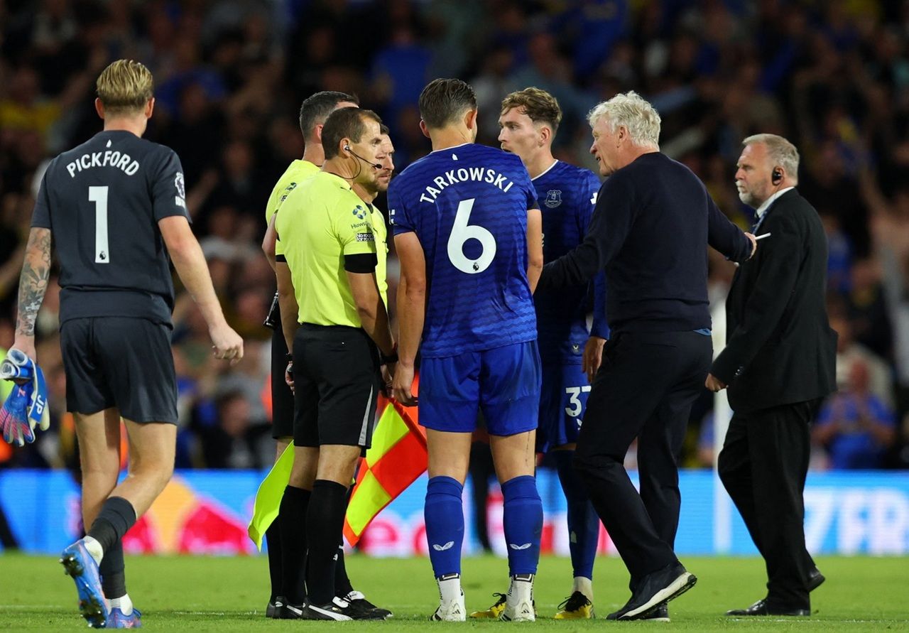Leeds United vs Everton 1-0, debut pahit Jack Grealish dan penalti yang menyakitkan. Foto: David Moyes (dua dari kanan) berbicara pada wasit soal keputusan penalti pada James Tarkowski.-Craig Brough -Reuters via Guardian