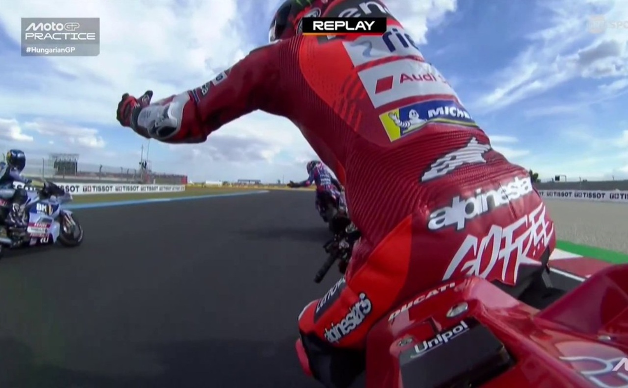 MotoGP Hungaria 2025: Alex Marquez - Jack Miller dihukum mundur 3 level, siapa yang salah? Foto: Pecco Bagnaia protes pada Alex Marquez di tengah lintasan Balaton Park saat practice, 22 Agustus 2025. -MotoGP-