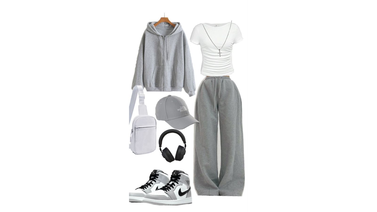 Set athleisure abu-abu dengan hoodie, jogger, dan crop tee putih, dilengkapi sneakers high-top, tas selempang, dan topi, cocok untuk gaya streetwear kasual.--Pinterest