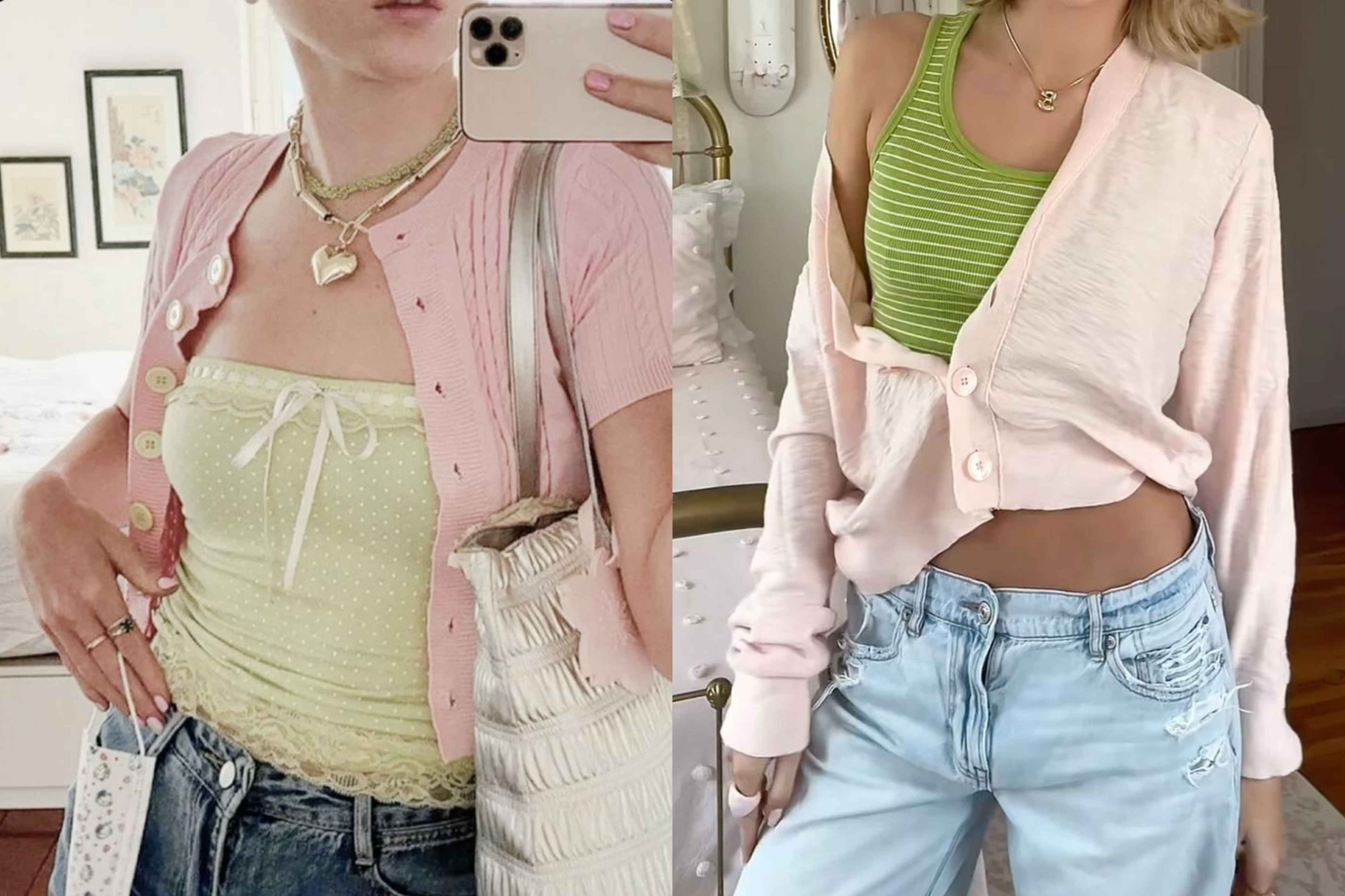 Outfit cardigan/outer pink dengan inner hijau bawahan jeans membuat gaya terlihat santai, tetapi tetap stylish. --Pinterest