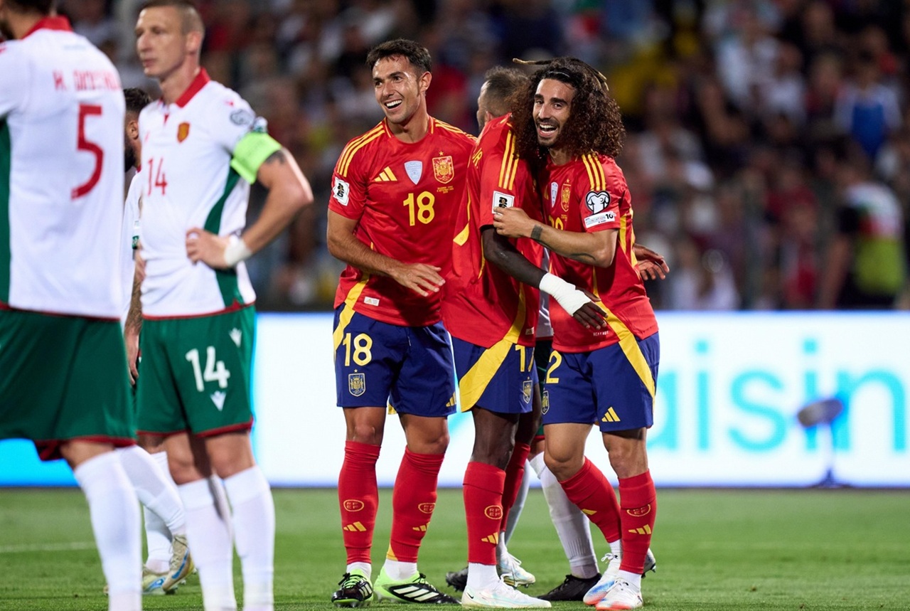 Bulgaria vs Spanyol 0-3, awal meyakinkan La Furia Roja. Foto: Marc Cucurella (kanan) merayakan golnya ke gawang Bulgaria di kualifikasi Piala Dunia 2026, 5 September 2025.-Nikolay DOYCHINOV -AFP
