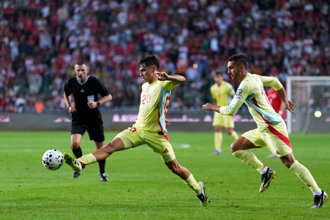 Aksi Pedri (kiri), membawa bola saat laga kontra Turkiye dalam lanjutan kualifikasi Piala Dunia 2026--Uefa.com