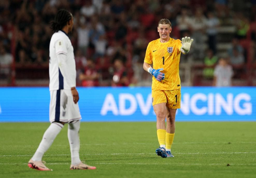 Jordan Pickford (kanan) seusai laga kontra Serbia, lanjutan kualifikasi Piala Dunia 2026, Rabu 10 September 2025--Uefa.com