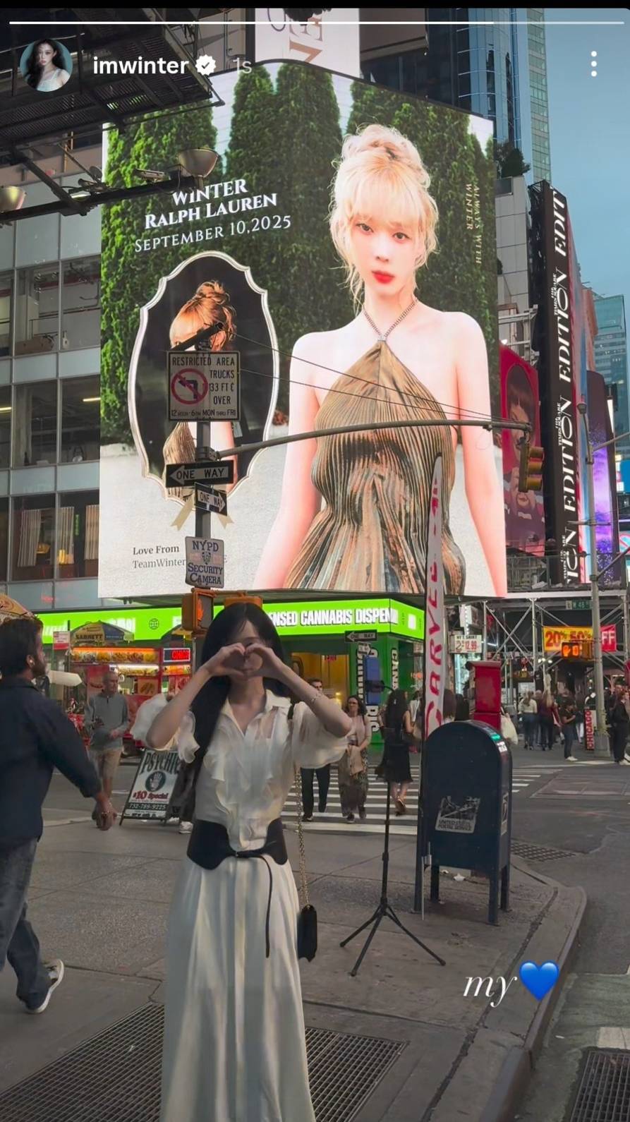 Tak hanya menghadiri fashion show, Winter juga menyempatkan diri untuk melihat proyek iklan billboard yang dipersembahkan oleh MY (sebutan penggemar aespa) di Times Square, New York.