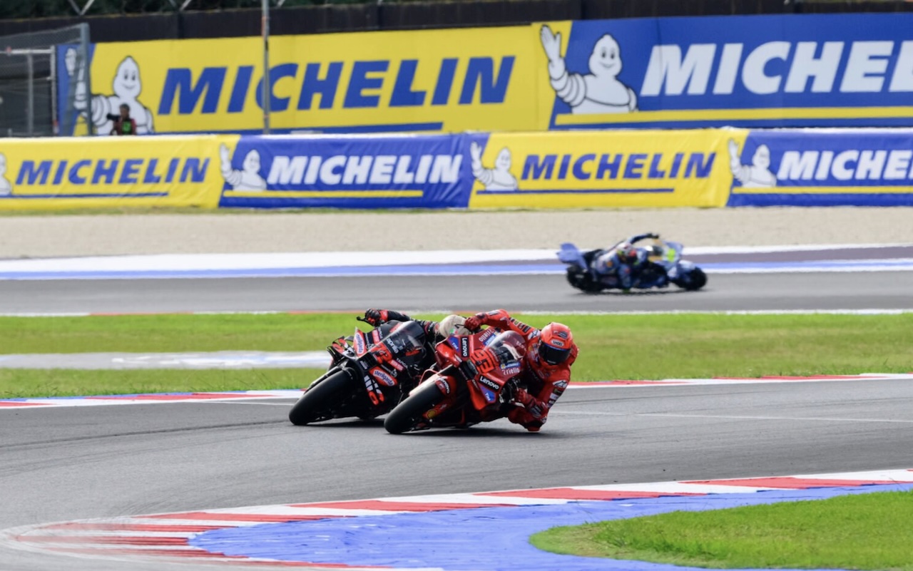MotoGP San Marino 2025: Marc Marquez jelaskan penyebab jatuh di Sprint Race. Foto: Marquez menyalip Bezzecchi di Sprint Race, 13 September 2025. -Gold and Goose-