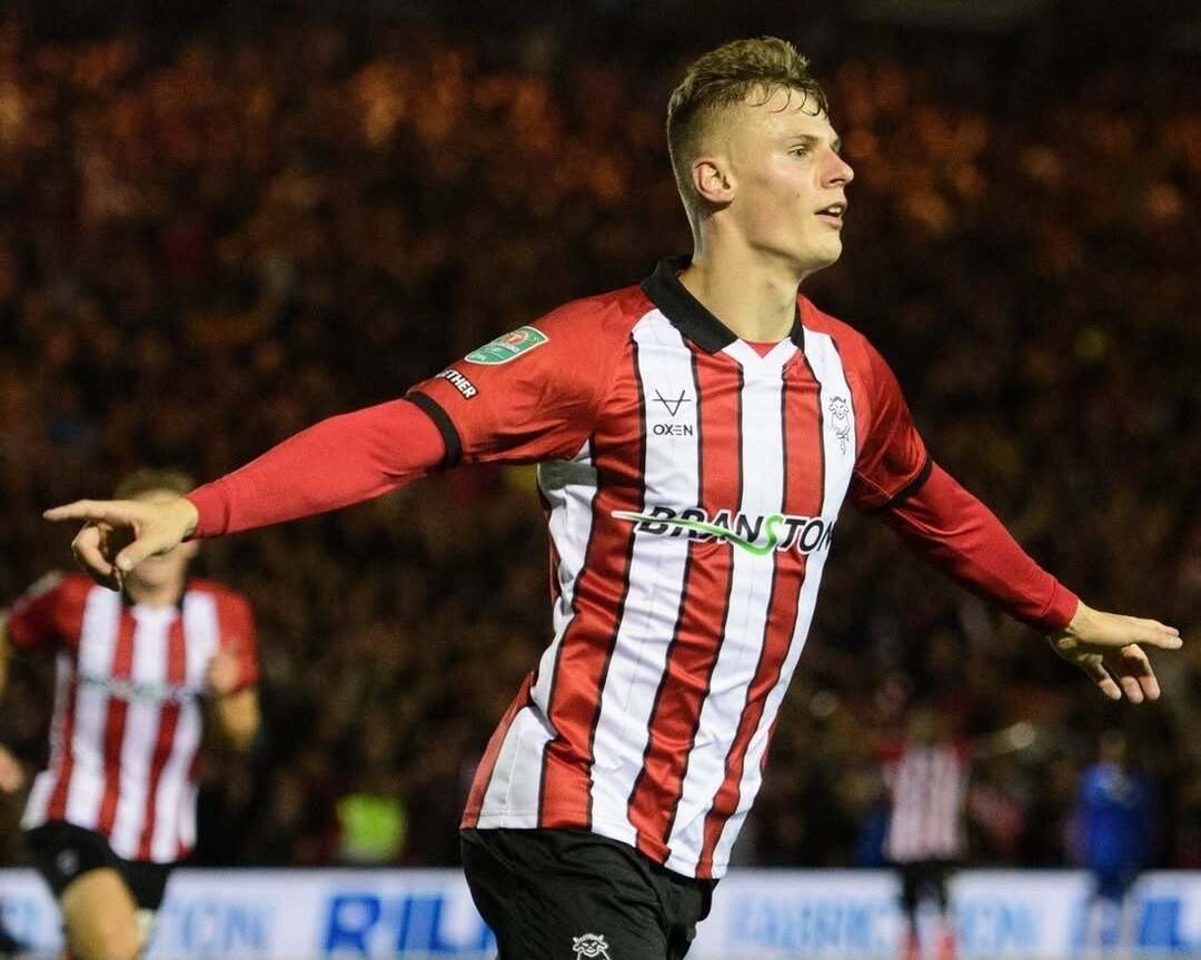 Selebrasi penyerang Lincoln City, Rob Street, usai mencetak gol pembuka ke gawang Chelsea pada ajang EFL Cup. Rabu, 24 September 2025--instagram @lincolncity_fc