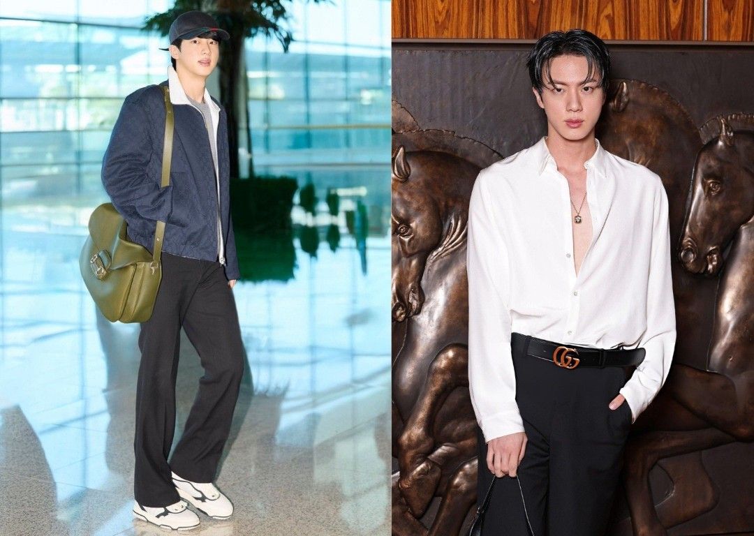 Sebagai global ambassador Gucci, Jin BTS hadir elegan dalam koleksi terbaru arahan Demna. Di bandara, Jin tampil casual chic dengan jaket oversized berbahan kulit hitam, dipadukan dengan celana denim gelap dan sneakers beraksen monogram klasik.