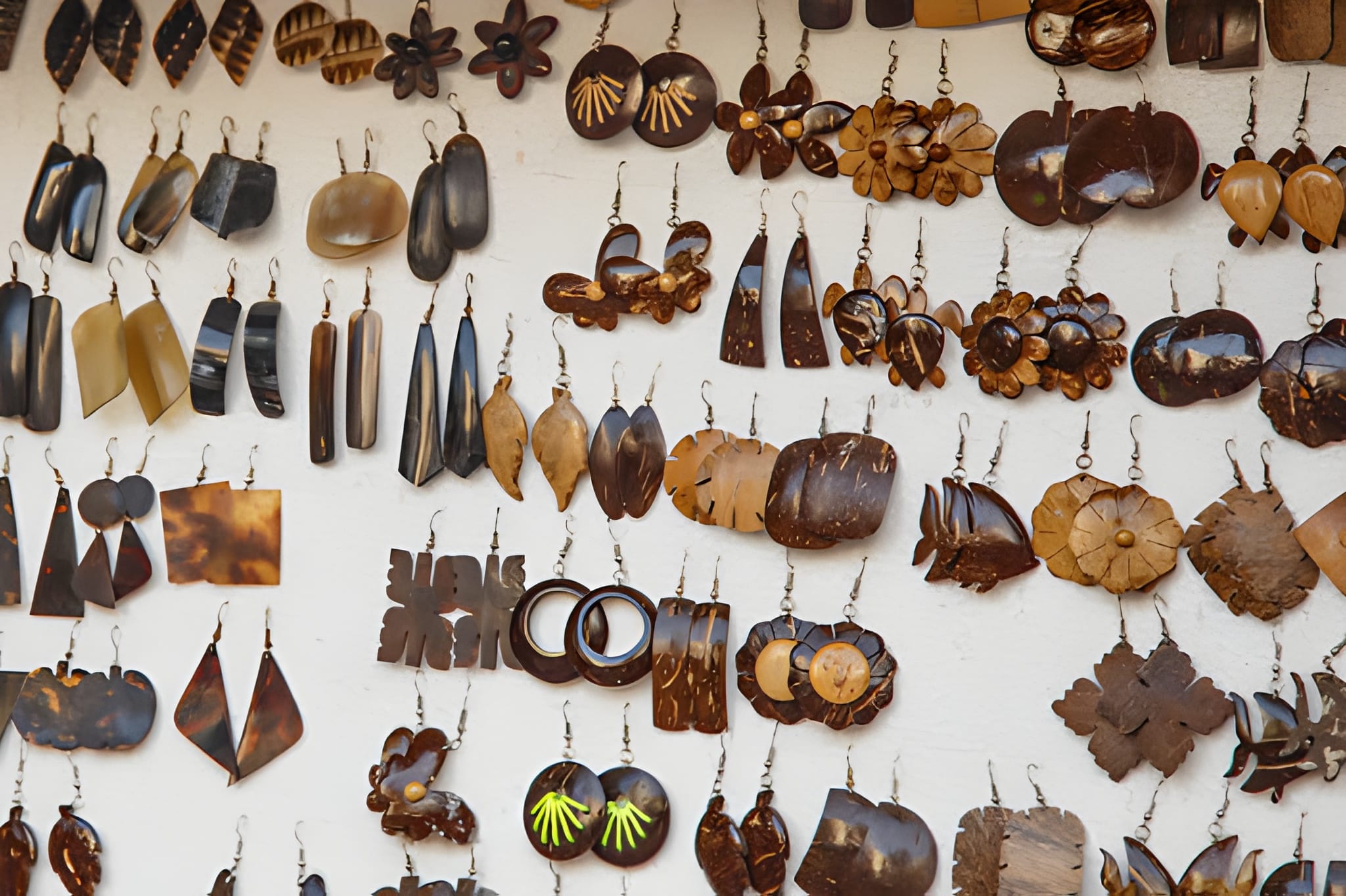 Pengrajin lokal banyak memanfaatkan kayu, rotan, tempurung kelapa, hingga kerang untuk membuat anting.