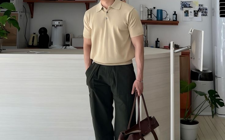 Untuk pria, kaus polo bisa menjadi pilihan workwear casual yang aman. Pasangkan dengan celana chino netral seperti warna beige atau navy, lalu tambahkan loafers atau sneakers semi-formal agar terlihat stylish.