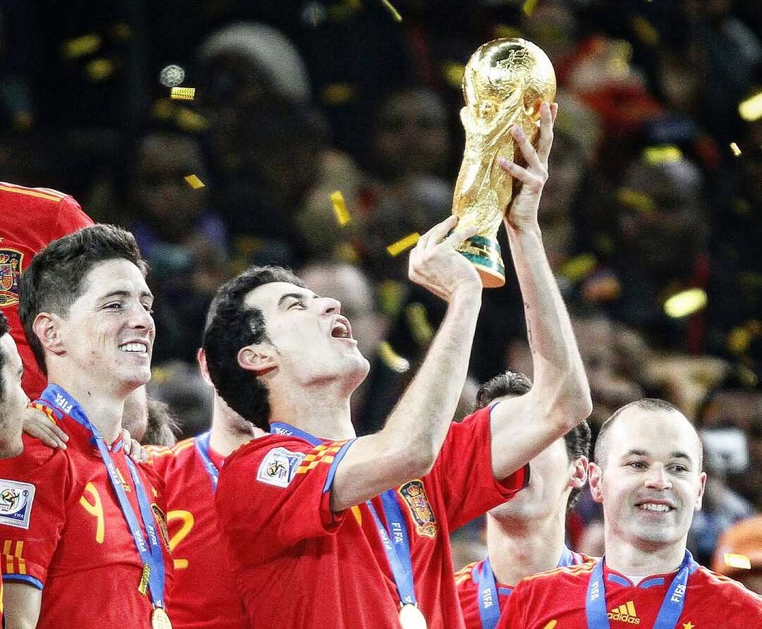 Sergio Busquets (mengangkat piala) ketika meluapkan kegembiaraan bersama rekan-rekan senegaranya usai membawa Timnas Spanyol menjuarai Piala Dunia 2010.--Instagram @fabriziorom