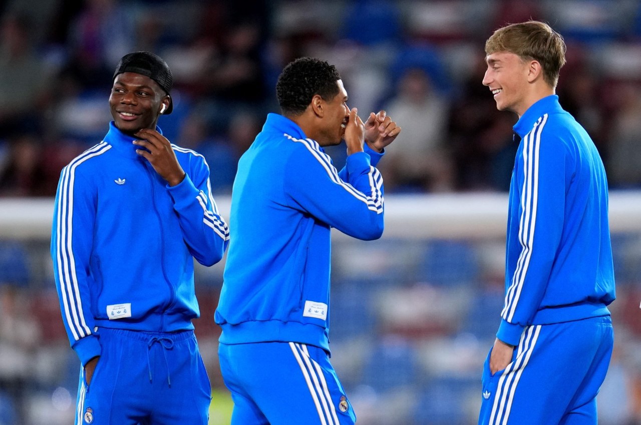Aurelien Tchouameni (kiri) Jude Bellingham (tengah) dan Dean Huijen (kanan) jelang laga kontra Atletico Madrid pada Sabtu, 27 September 2025-Aitor Alcade-Getty Images