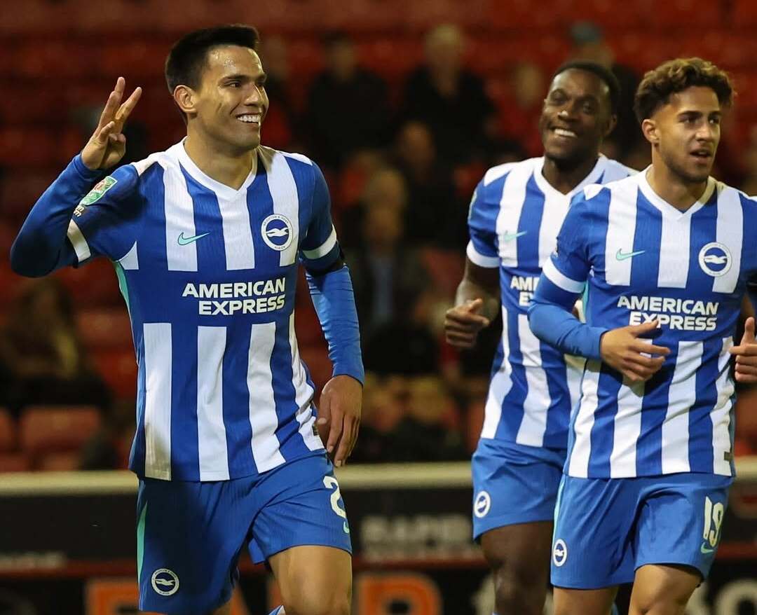 Selebrasi gelandang Brighton, Diego Gomez, usai mencetak gol keempatnya ke gawang Barnsley di ajang Carabao Cup.--instagram @officialbhafc