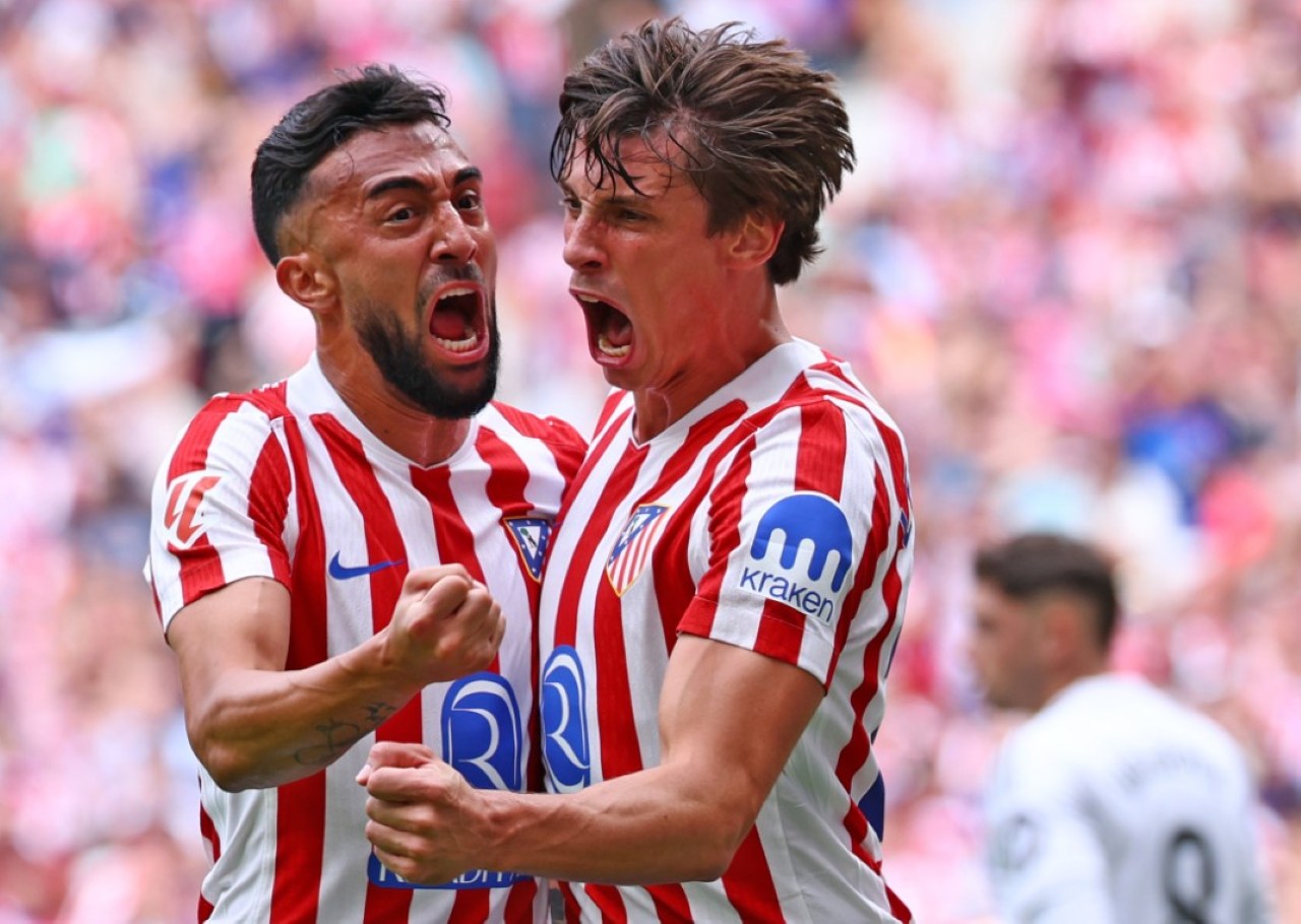 Nico Gonzalez (kiri) dan Robin Le Normand (kanan) melakukan selebrasi usai Atletico unggul 1-0 atas Real Madrid, Sabtu 27 September 2025--@Atleti-X
