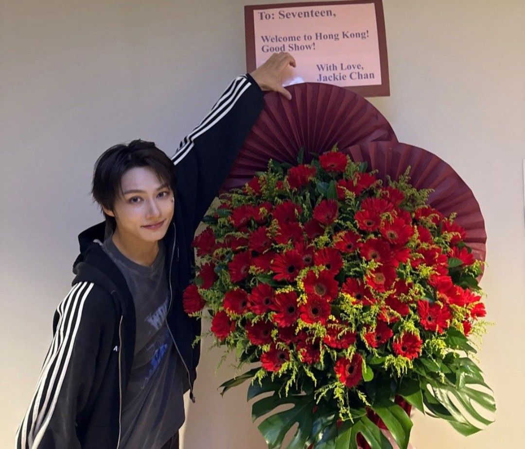 foto; Jackie Chan memberi rangkaian bunga dan ucapan selamat untuk konser SEVENTEEN di Hongkong-weverse -
