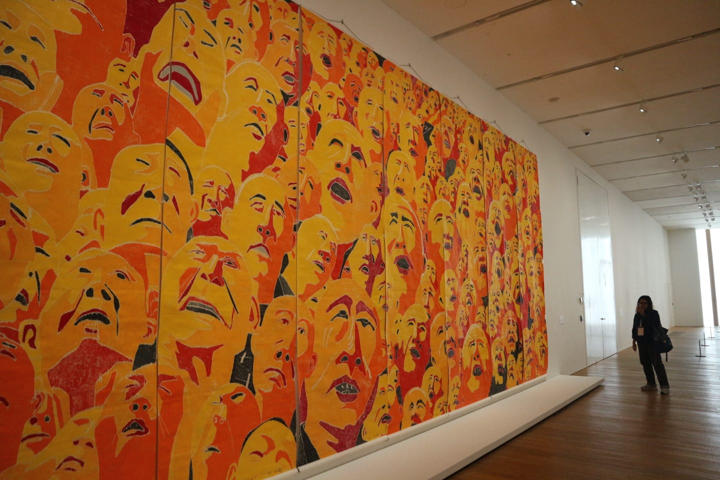 Di salah satu sudut galeri, terdapat karya yang cukup menarik perhatian. Judulnya SARS. Berwarna cerah. Namun, tiap sudutnya dipenuhi wajah-wajah dengan ekspresi tegang. Khawatir. Cemas. Itu merupakan karya Fang Lijun. Perupa asal Beijing, kelahiran 1963.