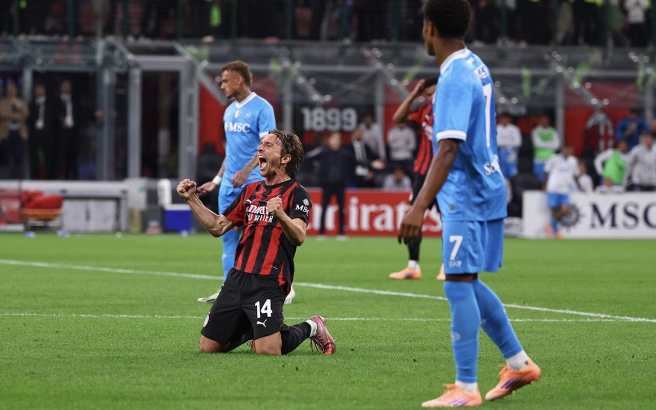 Napoli takluk pada AC Milan, Conte ogah disalahkan soal pemilihan bek. Foto: dua pemain Napoli hanya bisa menyaksikan Luka Modric merayakan gol Alexis Saelemaekers, 29 September 2025.-Piero Cruciatti-AFP