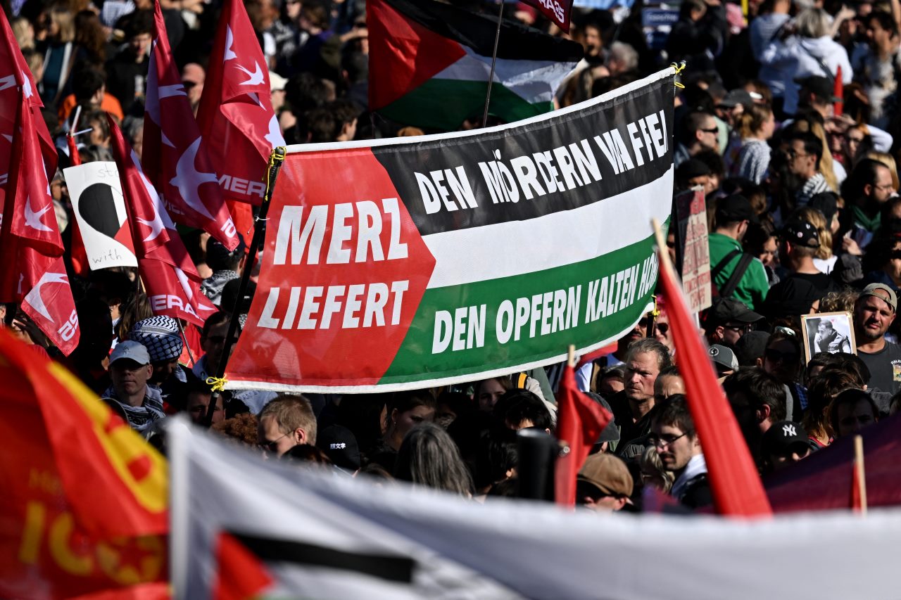 Peserta demonstrasi memamerkan spanduk berwarna bendera Palestina dengan tulisan ‘(Kanselir Jerman) Merz mengirim senjata kepada pembunuh, ejekan dingin terhadap korban’ selama demonstrasi dengan motto ‘Bersama kami menggambar garis merah: Bersama untuk G-Ralf Hirschberger-via AFP