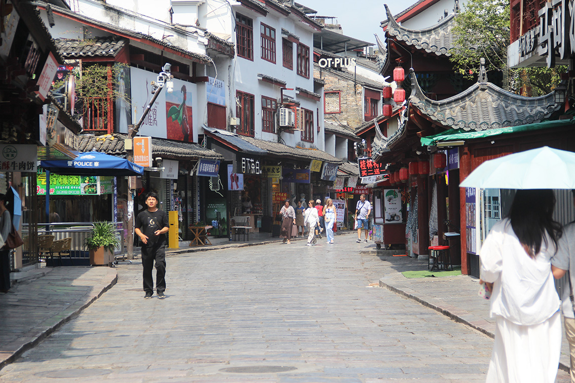 Jalan itu terasa mengilap. Ratusan ribu kaki turis melintasinya tiap tahun. Bangunan di kiri kanan tetap mempertahankan arsitektur Ming dan Qing. Dinding putih, atap melengkung, beberapa menampilkan jendela kayu dengan ukiran klasik.