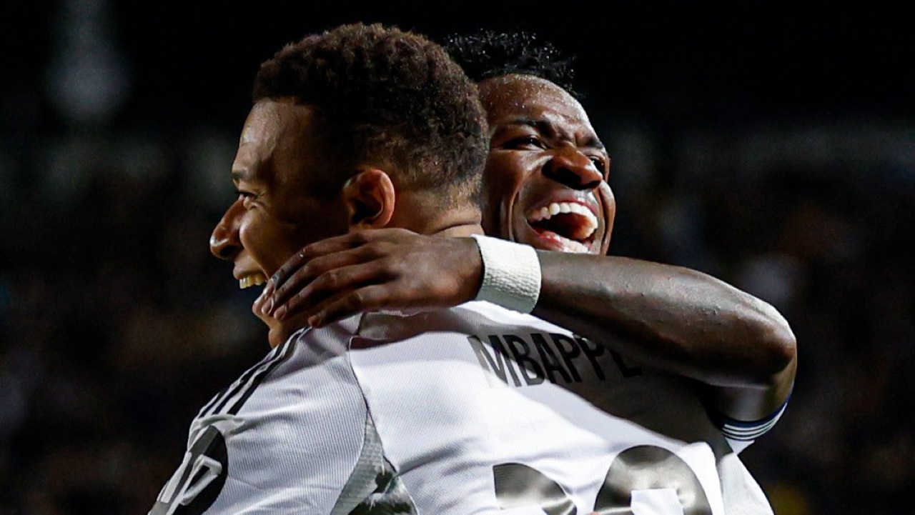 Kylian Mbappe dan Vinicius Junior melakukan selebrasi bersama setelah mencetak gol untuk Real Madrid saat melawan Kairat di laga kedua fase grup Liga Champions pada 30 September 2025-@realmadrid-X