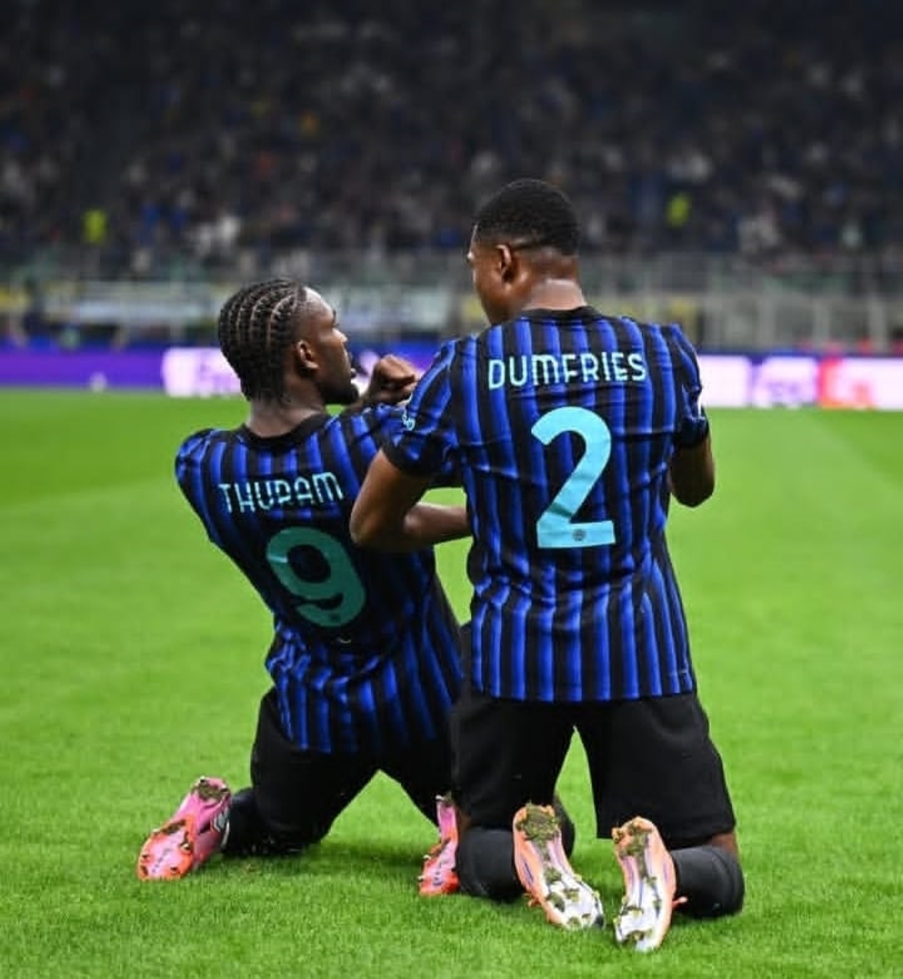 Selebrasi Denzel Dumfries dan Marcus Thuram ketika berhasil mencetak gol kedua bagi Inter Milan dalam lanjutan Liga Champions menghadapi Slavia Praha, Rabu 1 Oktober 2025-Marco Luzzani-Getty Images