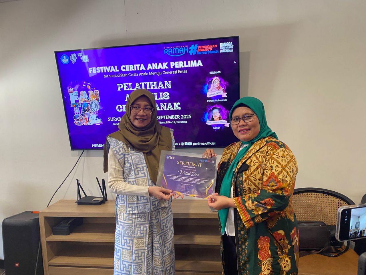 PUJI RETNO HARDININGTYAS (kanan) menyerahkan sertifikat penghargaan kepada Watik Ideo yang menjadi narasumber Pelatihan Menulis Cerita Anak pada Minggu, 28 September 2025.-Dokumentasi Fantasia Perlima-