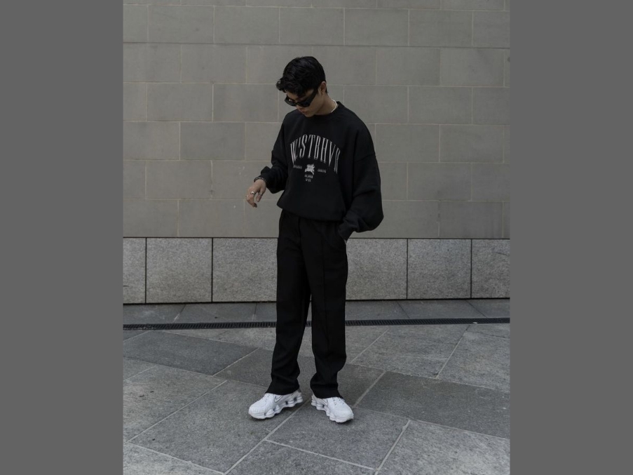 Bagi yang suka tampil rapi tanpa ribet, coba gaya monochrome. Misalnya crewneck hitam dengan celana hitam, lalu tambahkan sneakers putih sebagai aksen. Outfit ini memberi kesan minimalis tapi tetap keren.