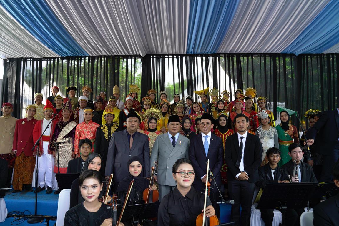 Tak hanya berinteraksi dengan para pelajar, Prabowo juga menyapa tim paduan suara yang sejak pagi bertugas membawakan lagu-lagu kebangsaan. Didampingi Menteri Kebudayaan Fadli Zon, Presiden tampak ramah saat berfoto bersama para anggota paduan suara OBade SMKN 2 Cibinong.