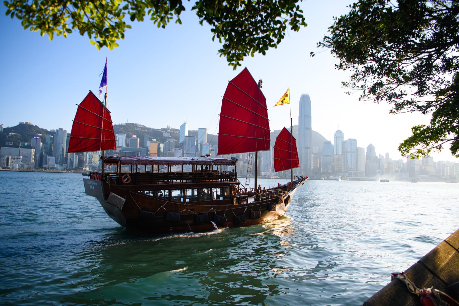 Di tengah panorama modern itu, sebuah kapal kayu tradisional berlayar anggun. Layar merahnya terlihat mencolok di antara gemerlap kota. Itulah Aqua Luna. Jung tradisional Tiongkok yang menjadi ikon Hong Kong.