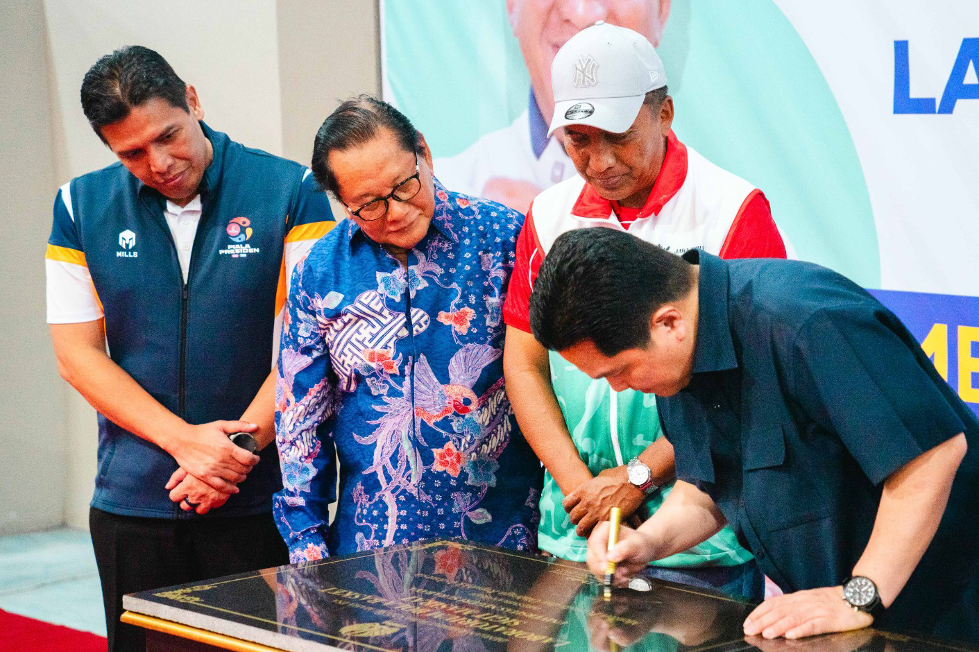 Menpora Erick Tohir menandatangani prasasti sebagai simbolis peresmian Laboratorium Bola Basket dan Laboratorium Petanque Cak Hasan di FIKK Unesa Kampus 2 Lidah Wetan, Surabaya, Kamis, 2 Oktober 2025 petang.-Humas Unesa-