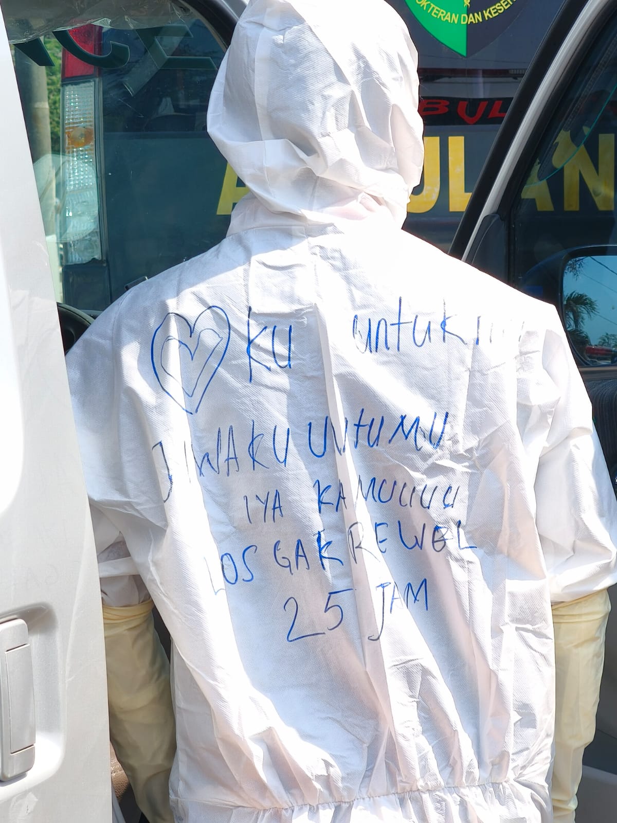 TULISAN semangat di APD yang dikenakan Saat Nasir, 50, diver ambulans LAZISMU Sidoarjo yang juga ikut proses evakuasi korban runtuhnya musala Ponpes Al-Khoziny, Sidoarjo, Jumat, 3 Oktober 2025.-Boy Slamet-