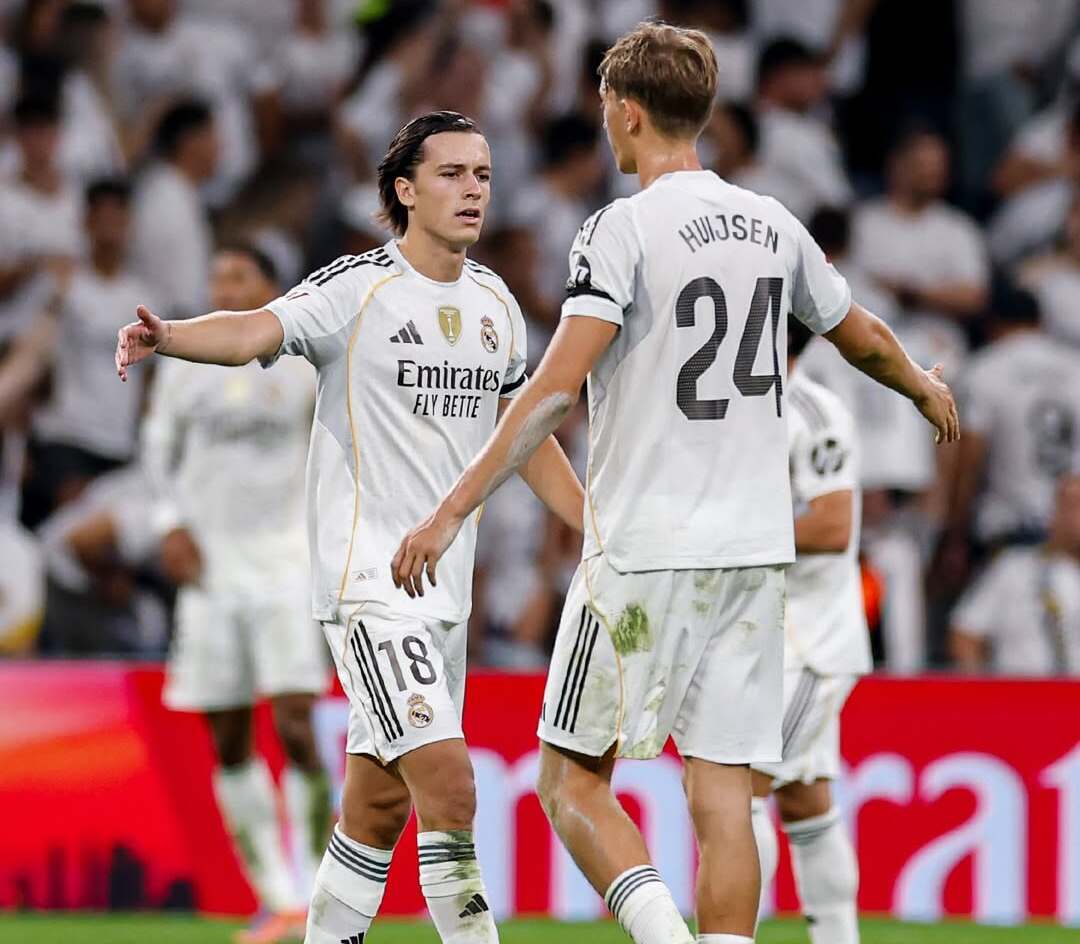 Dua bek Real Madrid, Alvaro Carreras (kiri) dan Dean Huijsen (kanan) merayakan kemenangan timnya usai mengalahkan Villarreal. Minggu, 5 Oktober 2025.--Instagram @realmadrid