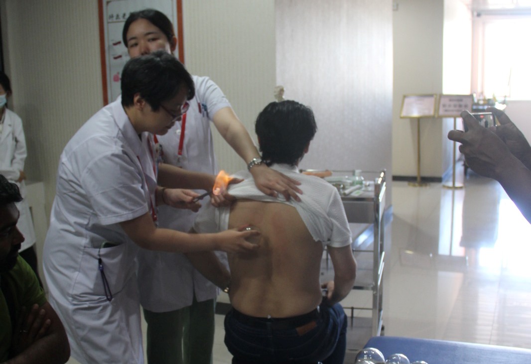PUNGGUNG IRFAN ASHRAF, jurnalis dari Pakistan yang menjadi tempat 'percontohan' bekam di Dongzhimen Hospital.-Doan Widhiandono-