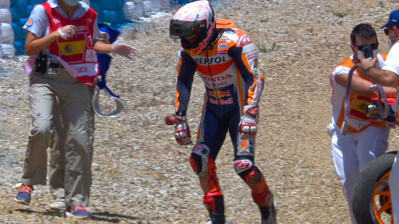 Marc Marquez setelah terjatuh dari motornya saat balapan di Grand Prix Spanyol tahun 2020 lalu.-MotoGP Official Website-MotoGP Official Website