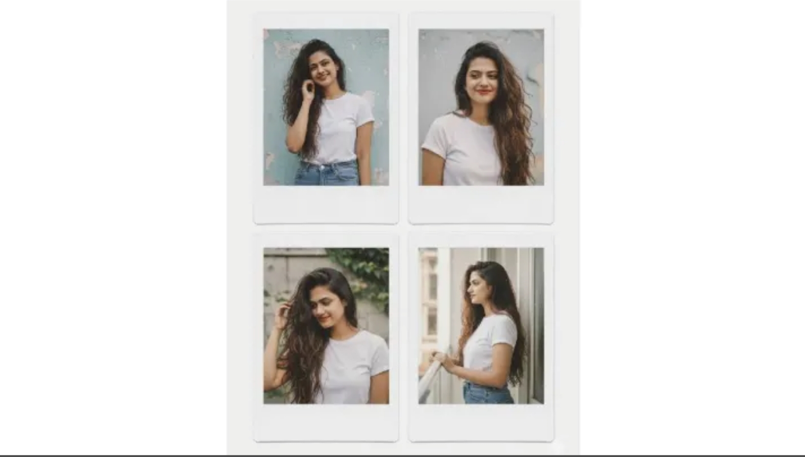 Prompt 1: Subjek mengenakan celana jeans biru dan kaos putih, berlipstik merah, berpose natural dengan rambut panjang bergelombang acak. Gaya yang ditampilkan meliputi ekspresi penuh renungan, pose bersandar di dinding, hingga gerakan spontan tangan menyibak rambut.