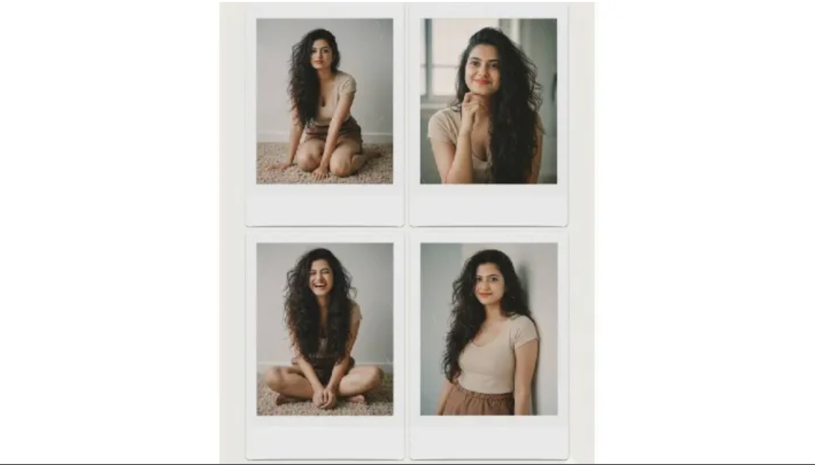 Prompt 5: Kesan santai dengan atasan krem dan celana pendek cokelat, ditambah lipstik coral. Foto memancarkan ekspresi tenang, senyum lepas, hingga gaya klasik dengan jari di dagu atau berlutut di atas karpet.