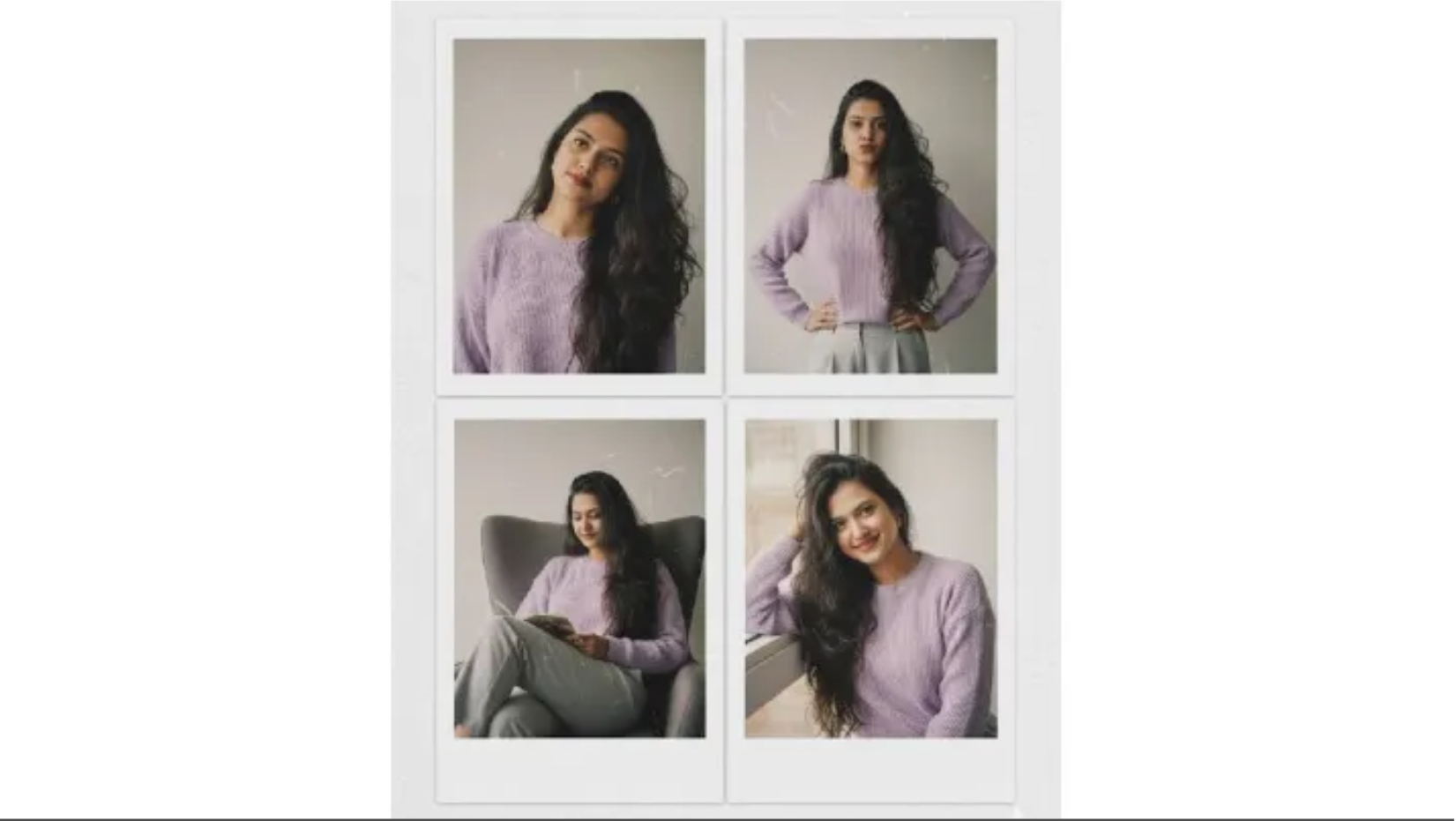 Prompt 4: Tampilan kasual dengan sweater ungu dan celana abu-abu, dipadukan lipstik berry. Potret menampilkan nuansa ceria, mulai dari tatapan penuh mimpi hingga pose ringan dengan tangan di pinggang atau duduk santai di kursi.