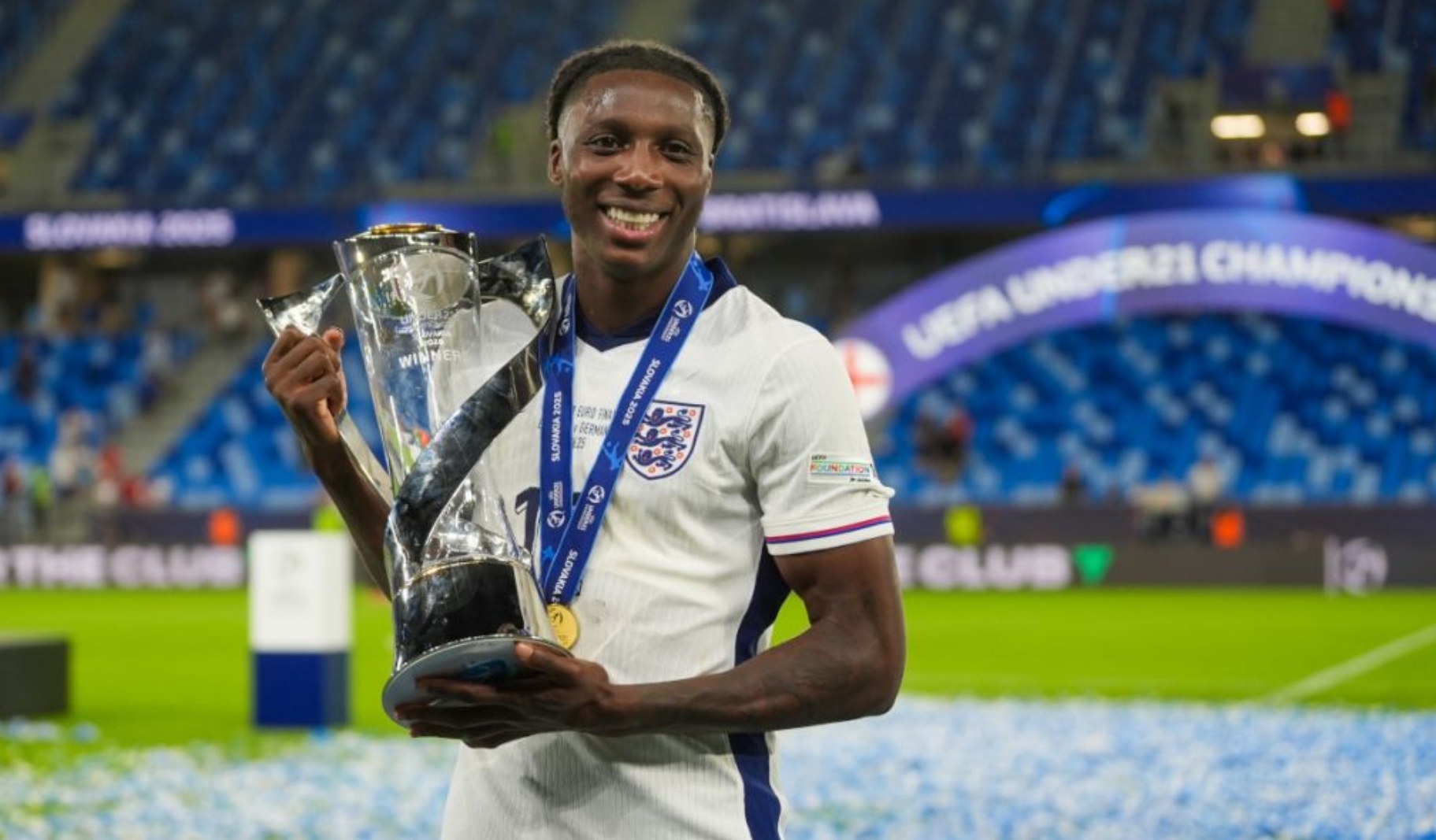 Brooke Norton-Cuffy saat bersama timnas Inggris dan meraih trofi kejuaraan Eropa U-21, 28 Juni 2025.-Christian Hofer-Getty Images