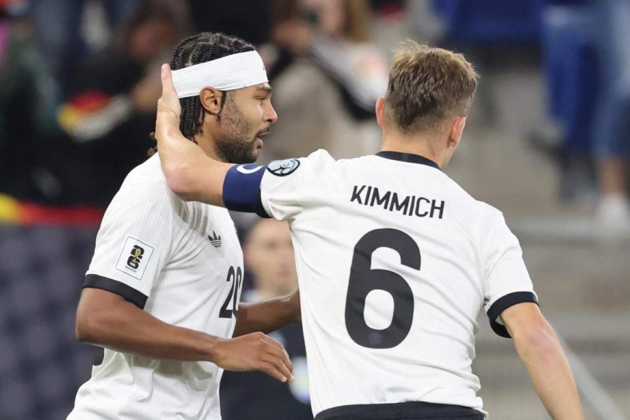 Selebrasi Serge Gnabry (kiri) bersama Joshua Kimmich (kanan) usai Jerman unggul 3 gol atas Luksemburg dalam laga lanjutan Kualifikasi Piala Dunia 2026, Sabtu 11 Oktober 2025--Uefa.com