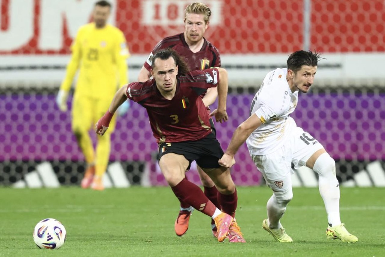 Belgia vs Makedonia Utara 0-0, Setan Merah gagal puncaki klasemen Grup J. Foto: Pemain Belgia Arthur Theate dan Kevin de Bruyne berebut bola dengan striker Makedonia Utara, dalam laga Kualifikasi Piala Dunia 2026, 11 Oktober 2025. -UEFA-
