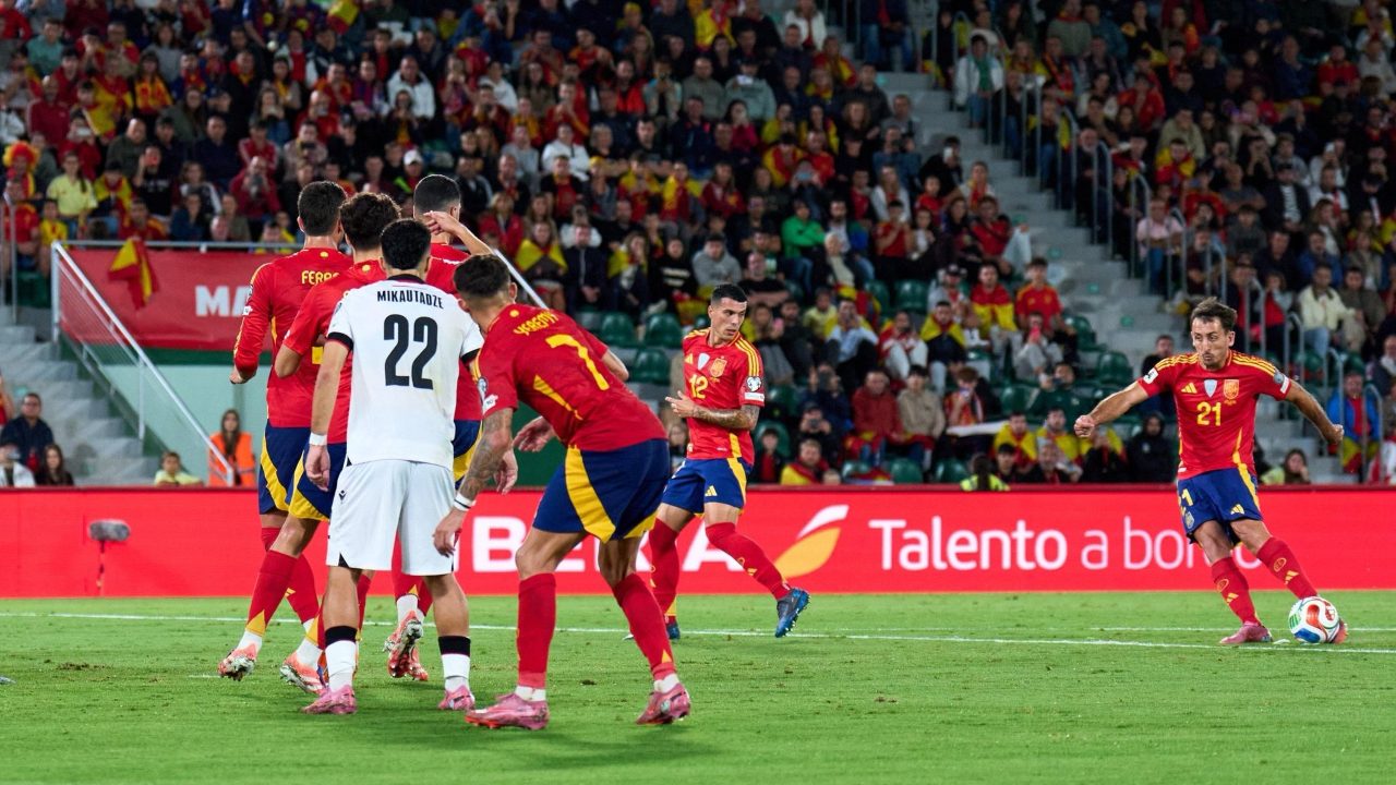 Mikel Oyarzabal melakukan tendangan bebas untuk mencetak gol kedua saat Spanyol melawan Georgia di laga Kualifikasi Piala dunia 2026 Grup E pada 12 Oktober 2025-@SpainIsFootball-X
