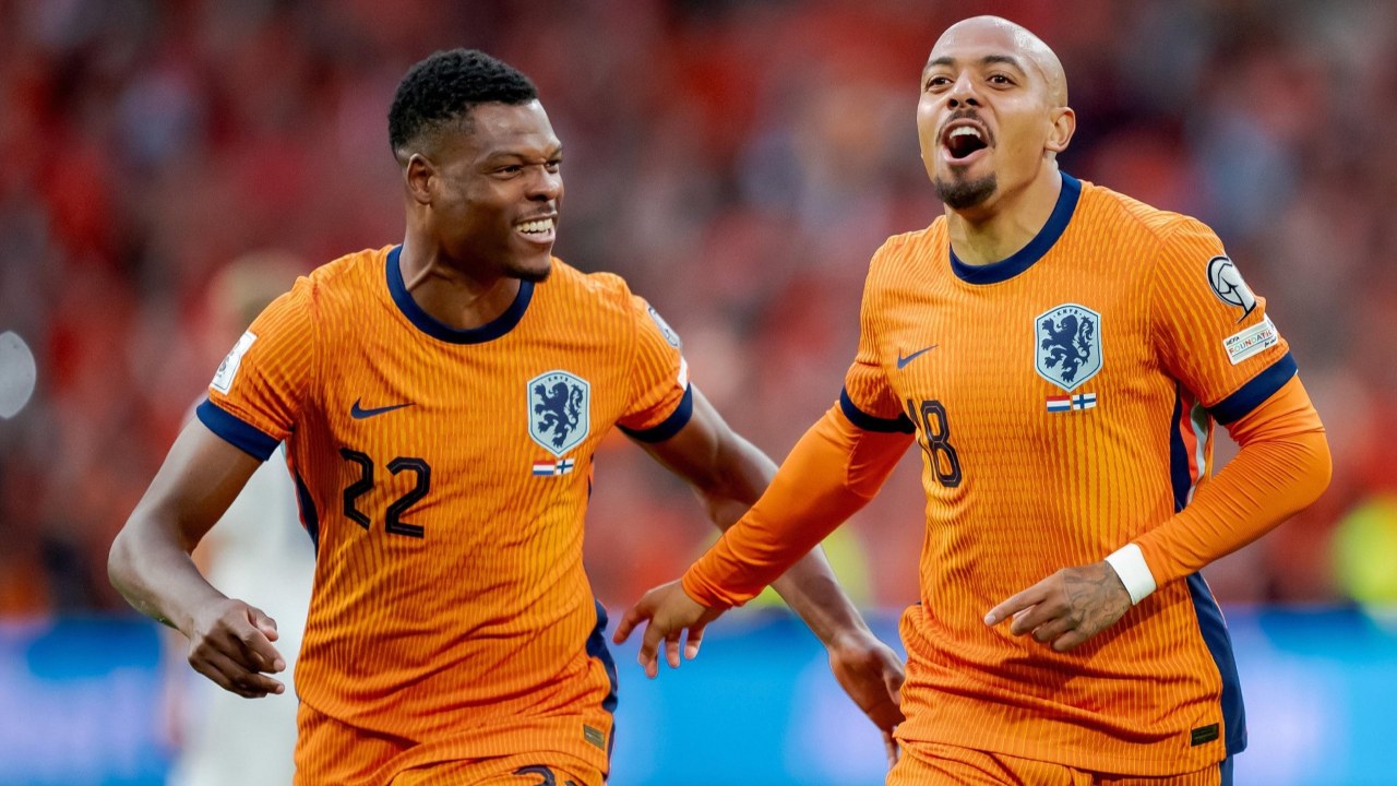 Donyell Malen melakukan selebrasi dengan Denzel Dumfries setelah mencetak gol untuk Belanda saat melawan Finlandia di Kualifikasi Piala Dunia 2026 Grup G pada 12 Oktober 2025-@OnsOranje-X