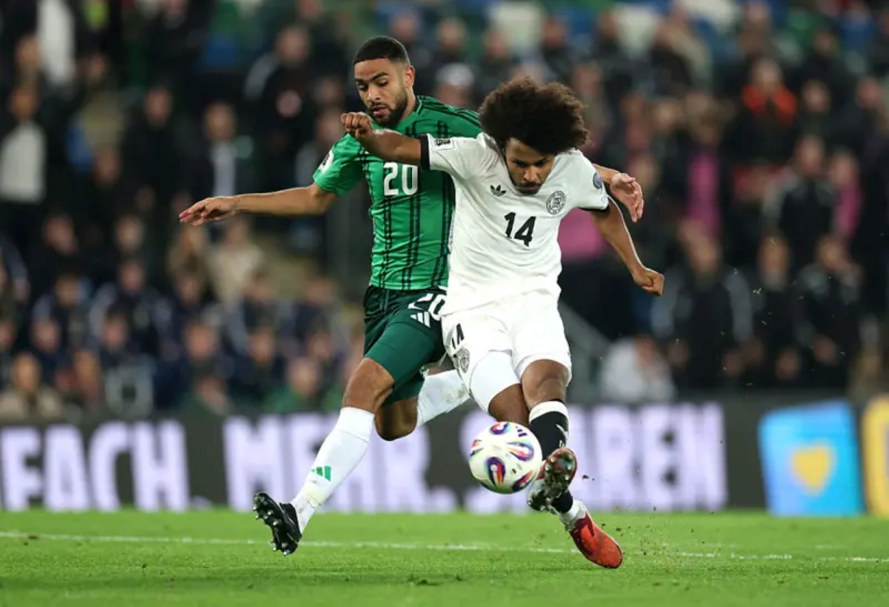 Aksi Karim Adeyemi (kanan) melakukan percobaan tendangan dalam laga Irlandia Utara vs Jerman, lanjutan Kualifikasi Piala Dunia 2026 Grup A Zona Eropa, Selasa 14 Oktober 2025--BBC Sports
