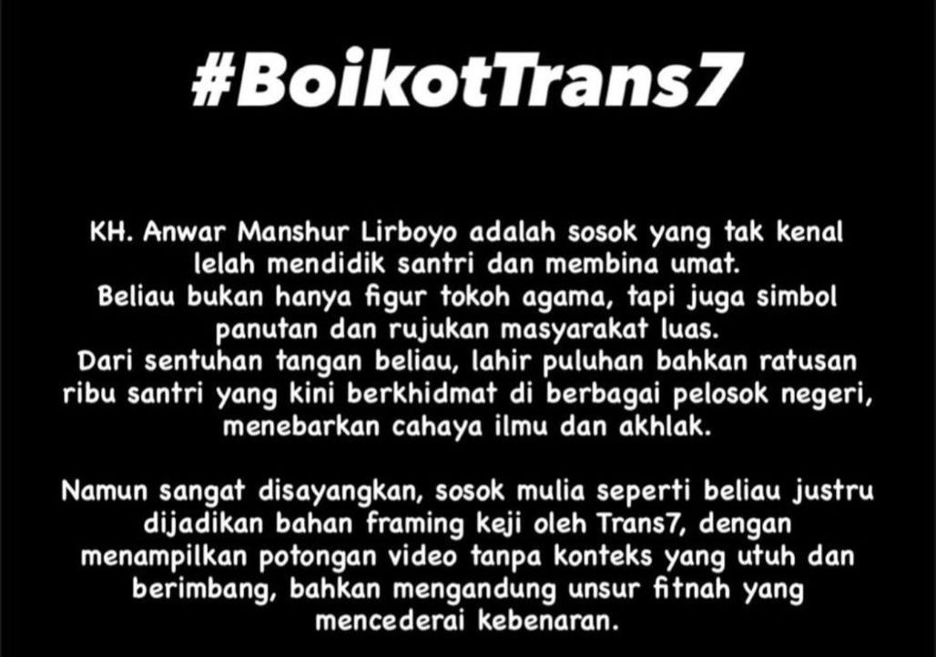 BACA JUGA:Boikot Trans7 Viral, Tayangan Investigasi Diduga Lecehkan Pesantren Lirboyo