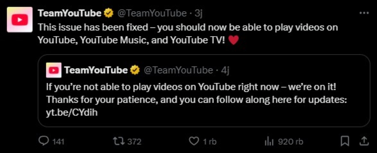 Foto: Pernyataan di platform X, YouTube menyampaikan bahwa gangguan telah berhasil diperbaiki.--X @TeamYouTube